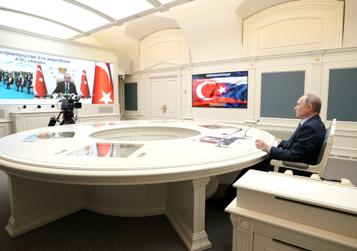 Президент РФ Владимир Путин и его турецкий коллега Реджеп Эрдоган по видеоконференции приняли участие в церемонии закладки фундамента третьего блока АЭС «Аккую», которую строит Росатом в провинции Мерсин на берегу Средиземного моря. Они дали старт строительству блока.