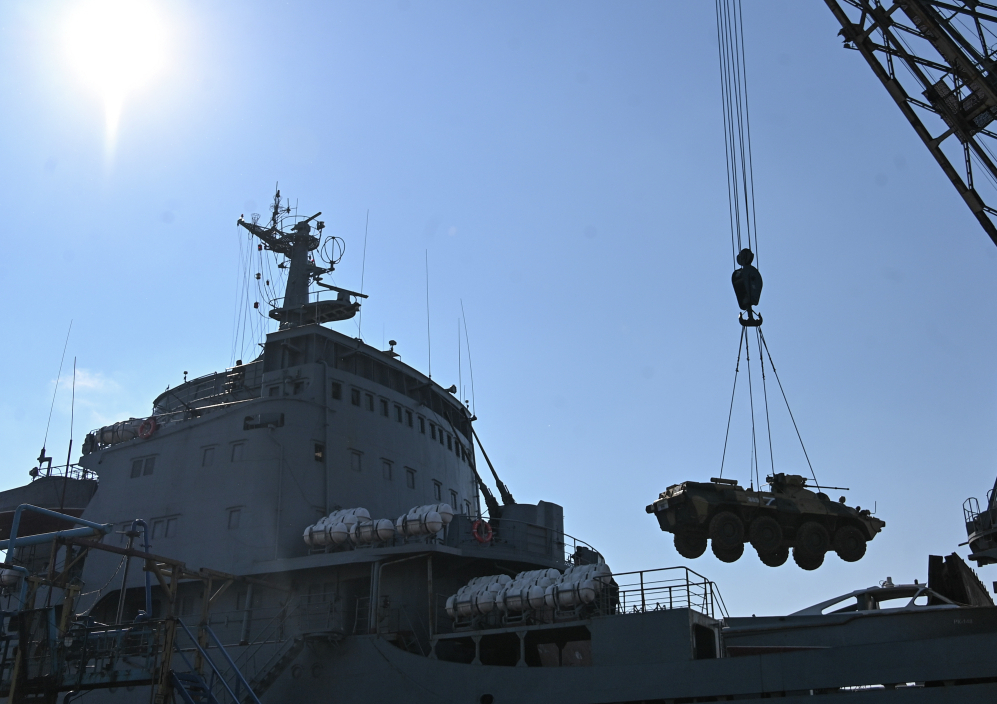 По данным телеканала, техника разгружается с помощью портовых кранов, работы ведутся под постоянными обстрелами со стороны украинских военных ракетами «Точка-У». Отмечается, что порт, как и весь город, защищают российские ПВО.