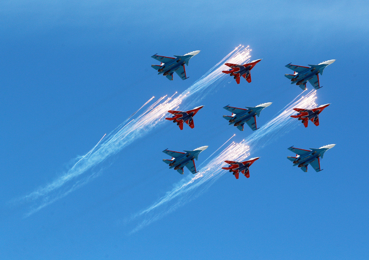 До этого в рамках парада в честь празднования 79-й годовщины победы в Великой Отечественной войне пилотажные группы «Русские витязи» и «Стрижи» исполнили знаменитый «Кубинский бриллиант» над Красной площадью. В маневре приняли участие девять самолетов Су-30СМ и МиГ-29, группу возглавил полковник Андрей Алексеев.