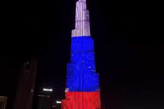 Дубайский небоскреб «Бурдж-Халифа» вечером 12 июня окрасился в цвета российского триколора под звуки гимна РФ. Таким образом Объединенные Арабские Эмираты отметили День России. Видео опубликовано в официальном аккаунте башни в социальной сети Facebook (входит в компанию Meta, которая в России признана экстремистской и запрещена).