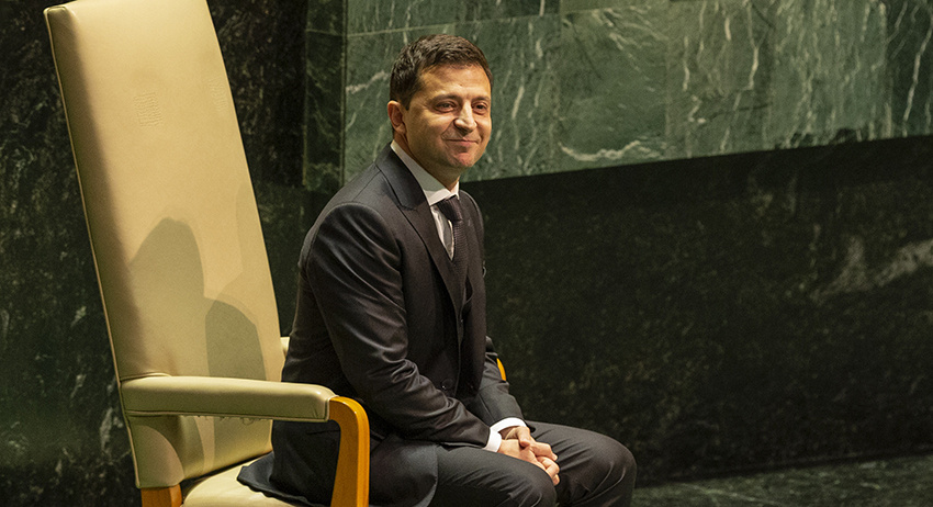Другая опубликованная Скабеевой фотография с данной встречи политиков запечатлела эпизод с «обратными» эмоциями её участников. На ней Зеленский пытается улыбаться, Трамп же, наоборот, имеет серьёзный вид.