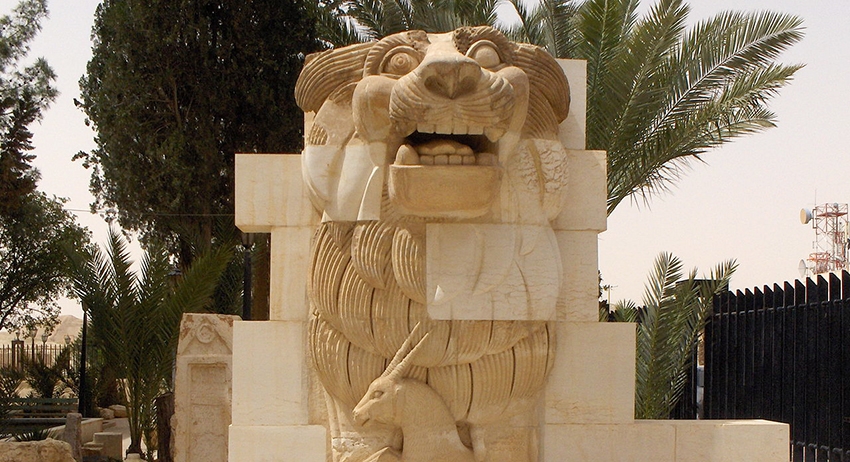 Эта скульптура украшала один из храмов Пальмиры. Она представляет собой 3,5-метровую статую льва, охраняющего газель. Археологи обнаружили ее в 1977 году.