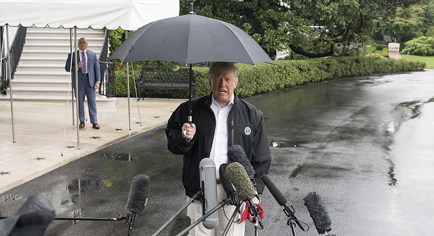 В Интернете появилось видео, на котором президент США разговаривает с журналистами, стоя под зонтом, в то время как Мелания ждёт рядом с непокрытой головой. Далее супруги направились к вертолёту. Однако Трамп весь путь держал зонт только над собой.