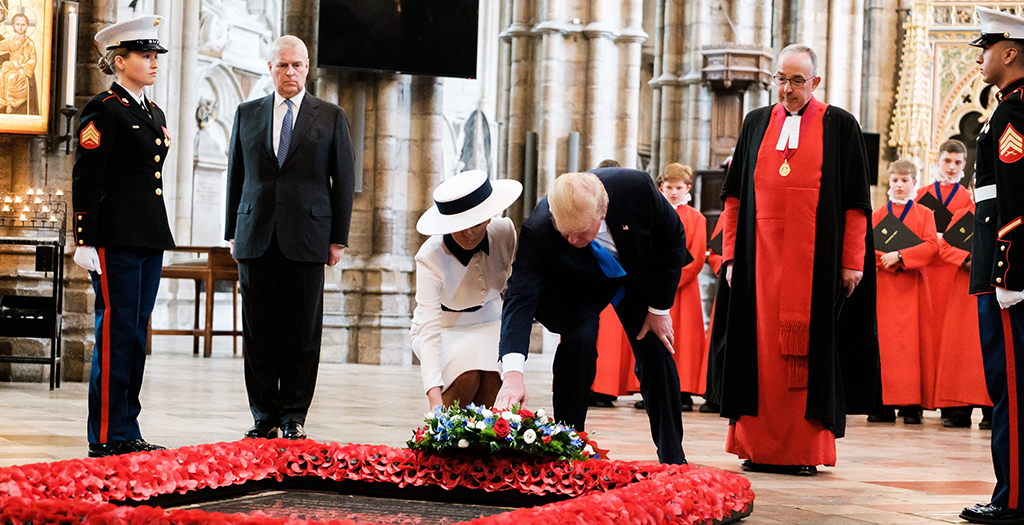 Американский президент Дональд Трамп в ходе государственного визита в Великобританию возложил венок к Могиле Неизвестного Солдата в Вестминстерском аббатстве. Его сопровождала первая леди США Мелания Трамп.