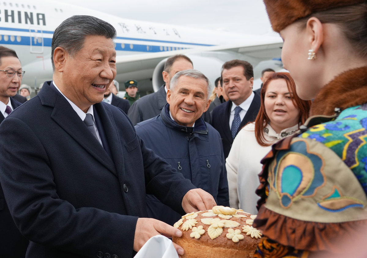 Председатель КНР Си Цзиньпин, прибывший для участия в XVI саммите БРИКС, во время церемонии встречи в аэропорту Казани. В центре — глава Республики Татарстан Рустам Минниханов