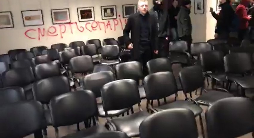 Радикалы находились в здании около получаса. За это время они успели разрисовать стены, сорвать российский флаг, угрожать сотрудникам, выкрикивая при этом экстремистские призывы.
