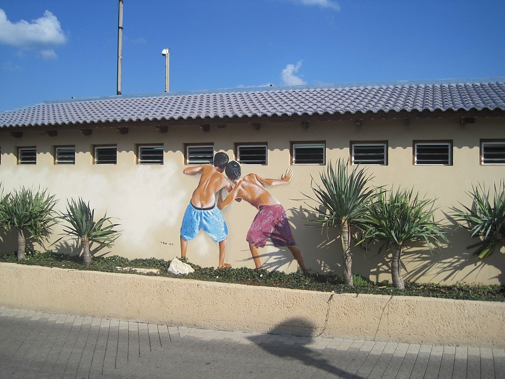 Рисунок создал уличный художник Рами Меири на здании женской раздевалки на пляже Мецицим. По словам мэра города Рона Хульдаи, утром 23 августа граффити было стёрто. Это было сделано на фоне акций протеста против насилия над женщинами, начавшихся после случая с групповым изнасилованием несовершеннолетней девушки в Эйлате.