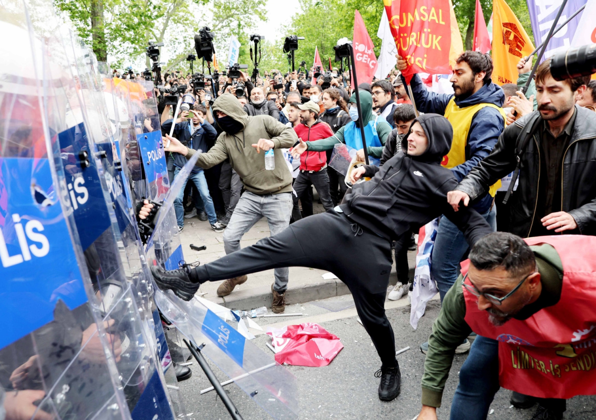 Столкновения протестующих с полицией во время первомайской демонстрации в День труда в Стамбуле Столкновения протестующих с полицией во время первомайской демонстрации в День труда в Стамбуле Фото: EPA/ТАСС