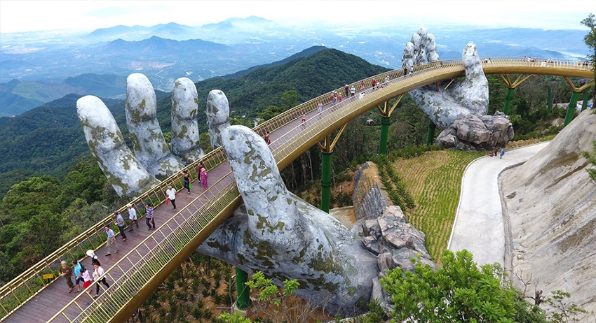 Архитекторы и строители возвели «Золотой мост» во Вьетнаме, в городе Дананг, в горной местности на высоте 1400 метров. Сооружение имеет необычный и впечатляющий внешний вид: его опорами служат две огромные каменные руки.