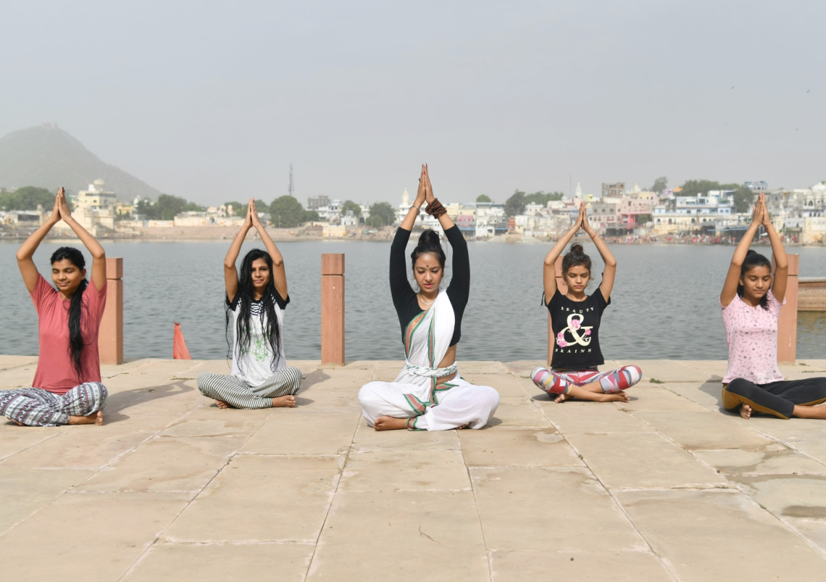 Практикующие занимаются йогой по случаю Международного дня йоги. Пушкар. Индия