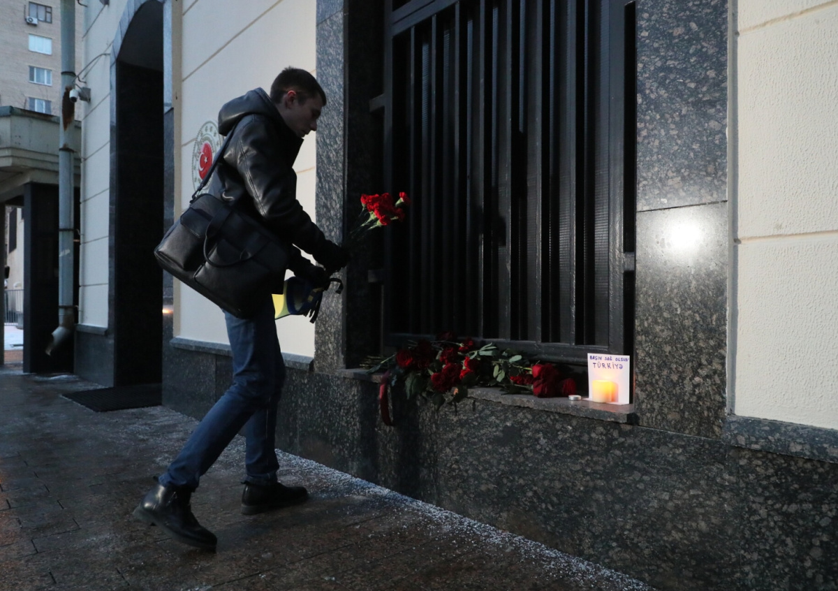 К турецкому посольству москвичи приносят цветы и зажигают свечи в память о жертвах стихийного бедствия.