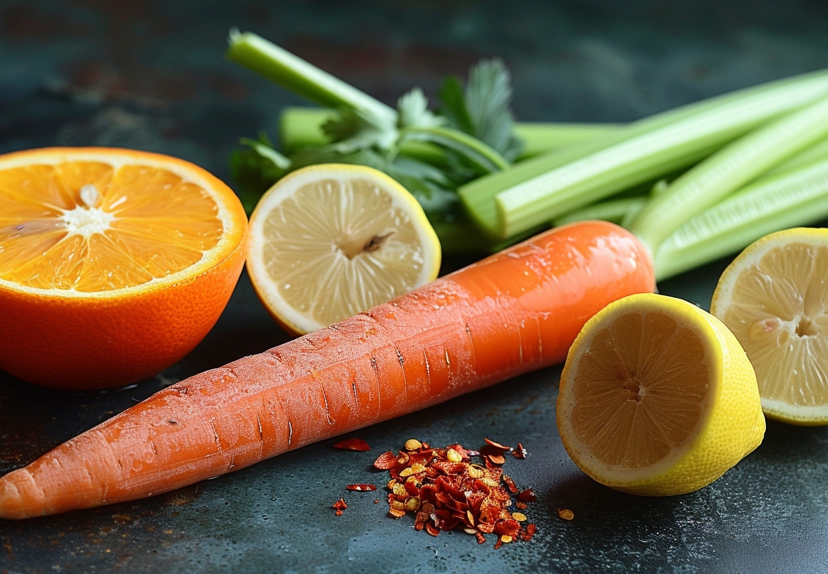 Возьмите половину моркови, стебель сельдерея, четвертинку лимона, щепотку сушеного острого перца чили. Очистите морковь, в соковыжималке выжмите сок из моркови и стебля сельдерея. Сок лимона смешайте с полученной овощной смесью, добавьте перец и перемешайте. Выпейте перед ужином одним глотком.